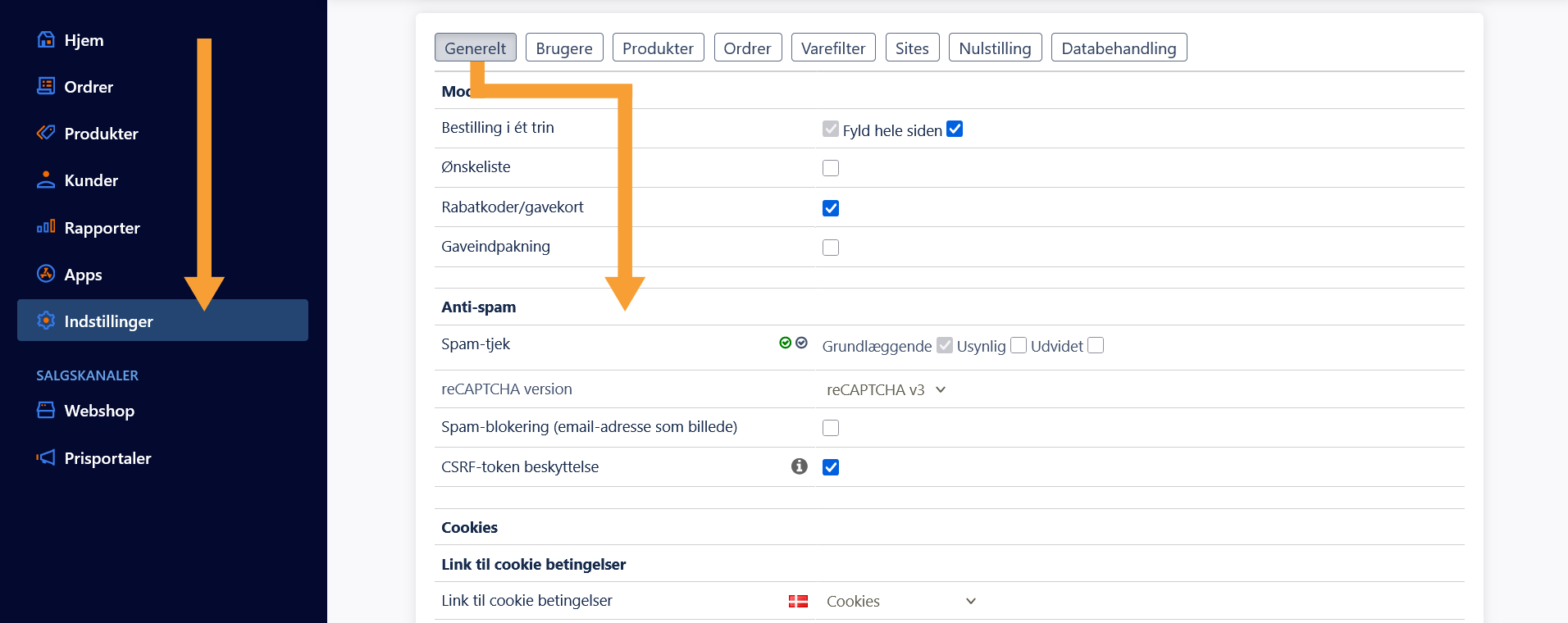Indstillingerne for reCAPTCHA finder du under Indstillinger > Webshopindstillinger > Generelt i shoppens administration: