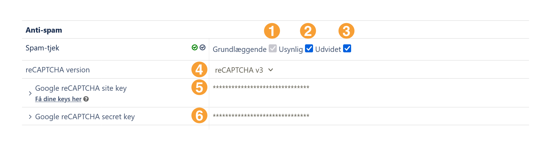 reCAPTCHA version:reCAPTCHA v2 kræver synlig brugerinteraktion (afkrydsningsfelt eller billedgåder) til verifikation, hvilket afbryder brugerflowet, men tilbyder enkel sikkerhed mod basale bots, mens reCAPTCHA v3 arbejder usynligt i baggrunden og analyserer brugeradfærd. Hvis du benytter reCAPTCHA med nøgle via funktionen Udvidet skal den nøgle du opretter ved Google matche den valgte version i dette felt.