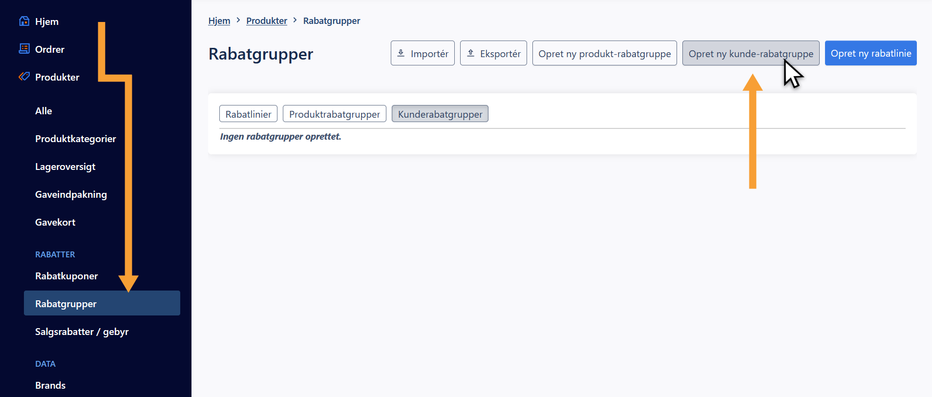 • Opret en kunderabatgruppe under Produkter > Rabatgrupper. Klik på knappen Opret ny kunderabatgruppe: