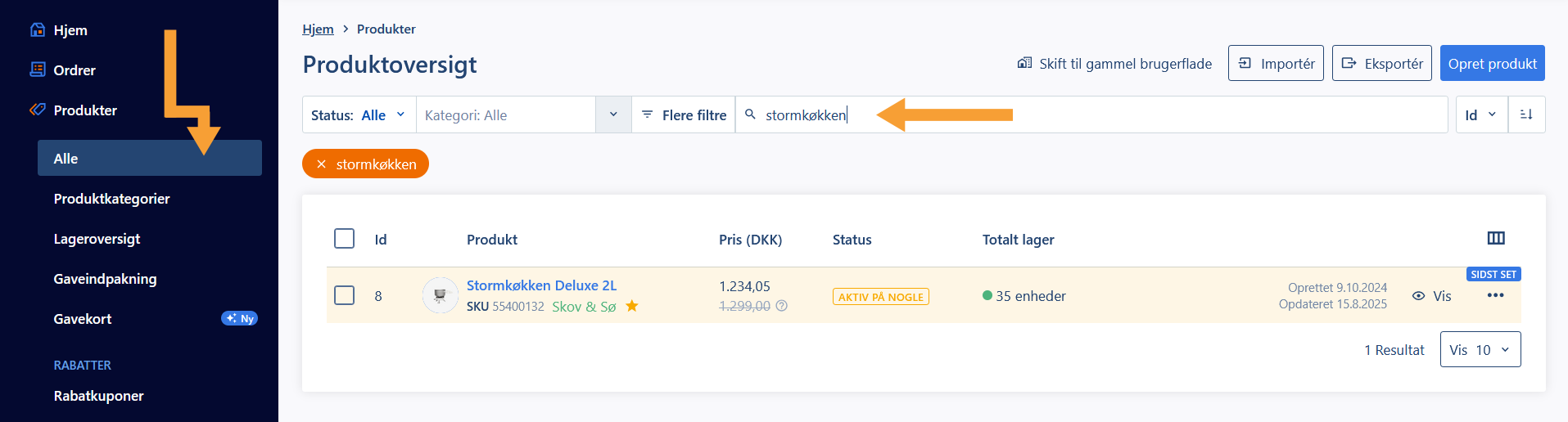 • Nu er din kunderabatgruppe oprettet, men den gør ingen ting, ud over, at den har et navn. Vi skal derfor tilknytte den til et produkt og sætte en rabat. Gå til Produkter > Alle, og vælg et produkt: