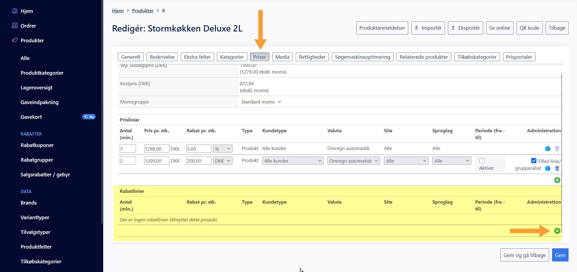 • Gå til fanen Priser og klik på det grønne plus-ikon ud for Rabatlinjer (markeret med gul):