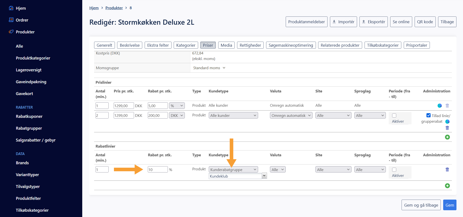 Husk at gemme dine ændringer. Bemærk: Vi har valgt, at rabatten skal gælde ved køb af ét eller flere produkter i første felt. Dette kan ændres, hvis du ønsker, at rabatten først skal gælde, hvis kunden køber mere end 1 produkt.