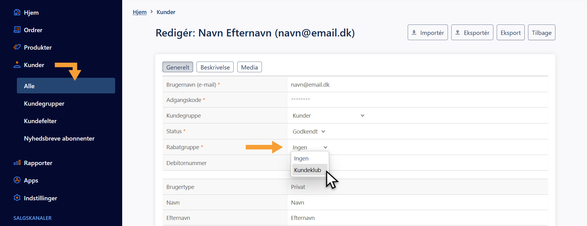 • Det sidste vi skal gøre for, at tilknytte vores kunderabatgruppe til vores kunder så de kan begynde, at bruge rabatterne. Gå til Kunder > Alle, og klik på en kunde. Klik på Rabatgruppe og vælg din nye kunderabatgruppe: