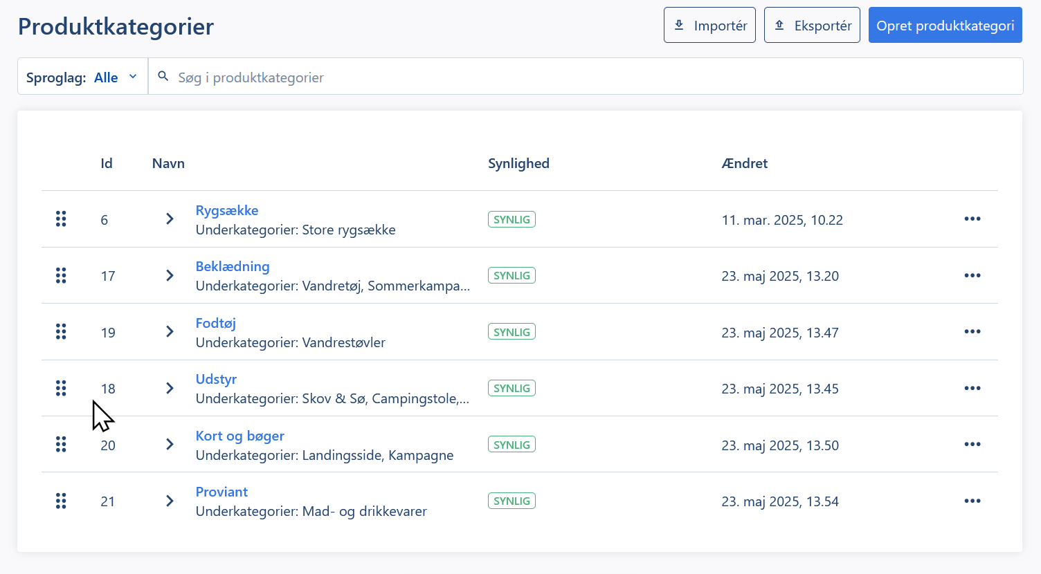 Fra oversigten har du mulighed for at oprette, redigere, sortere og slette produktkategorier. Du kan også importere og eksportere kategorier fra denne side.