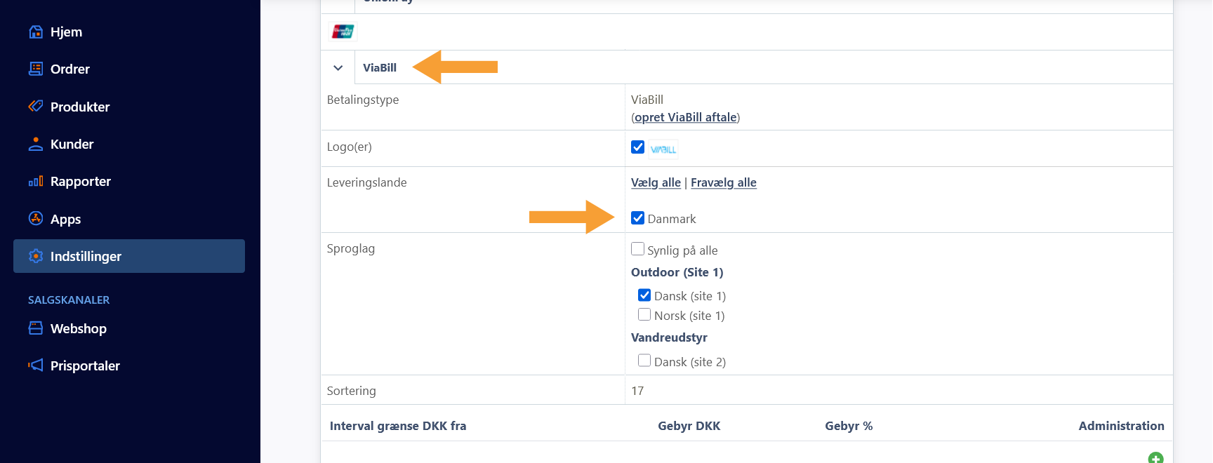 På billedet herover har vi aktiveret ViaBill på betalingsmetoden og valgt leveringslandet Danmark.
